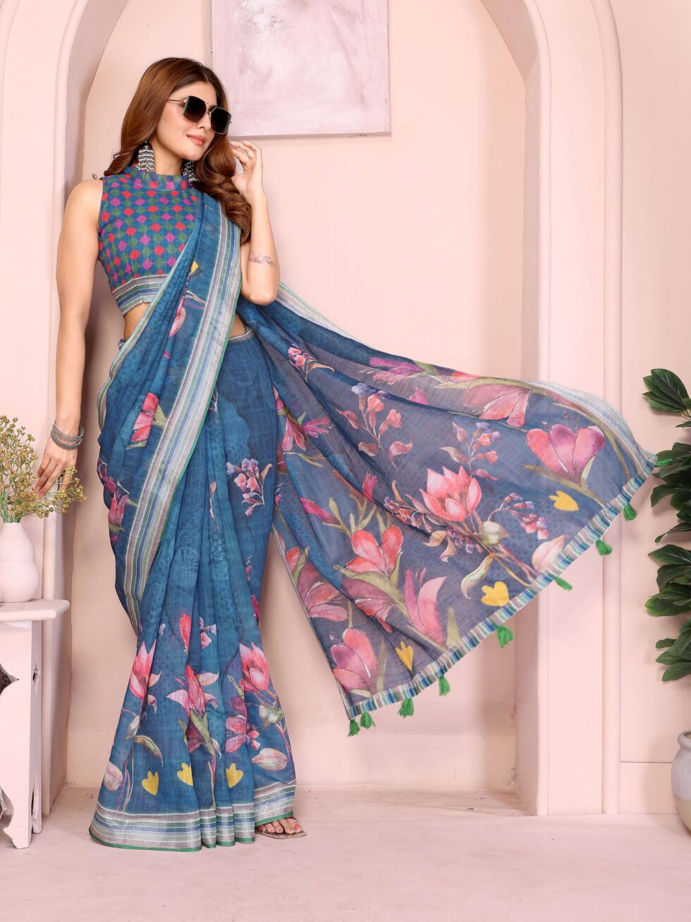 Step out in style with the Elegant Linen Cotton Saree featuring a Vibrant Floral Print. Made from soft, breathable linen cotton, this saree offers a lightweight drape that ensures comfort for long hours while keeping you effortlessly elegant.