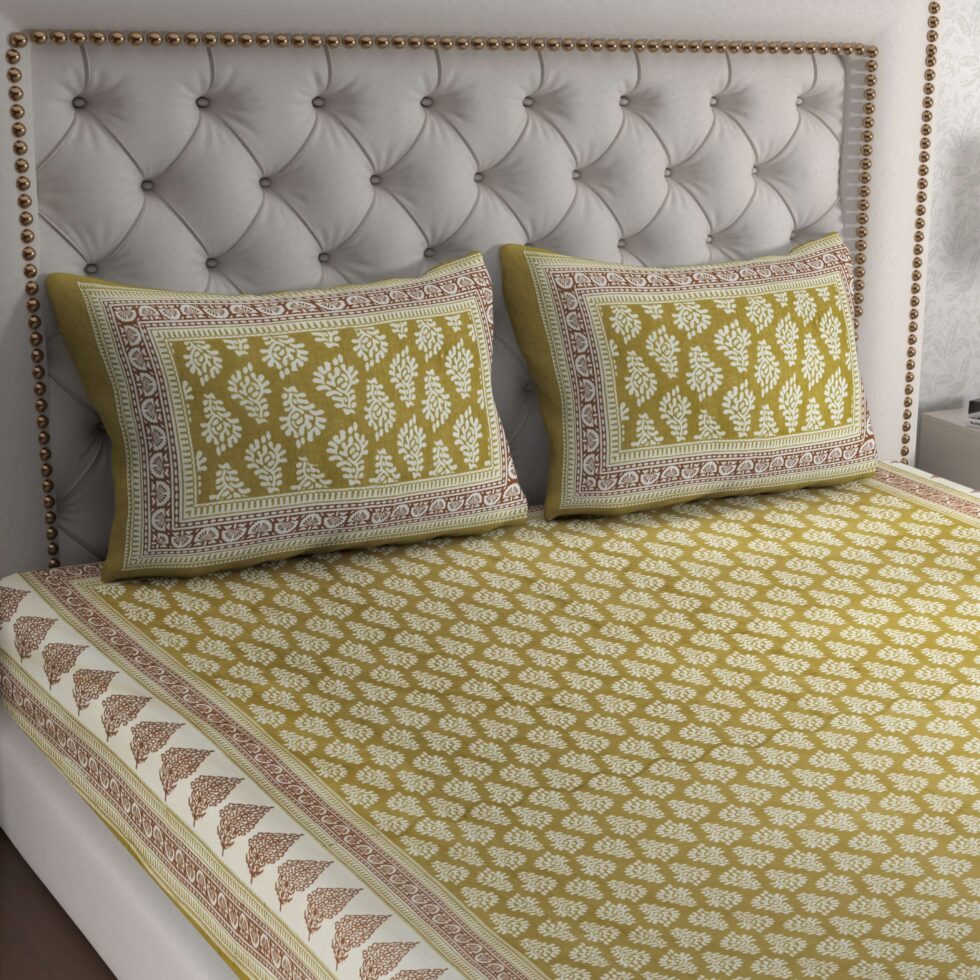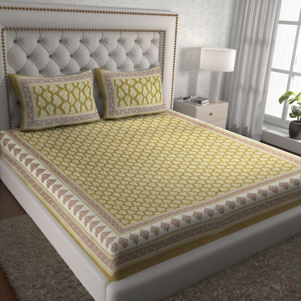 Enhance your bedroom décor with this Jaipuri Cotton Printed Double Bedsheet. Crafted from 100% pure cotton, it offers softness, breathability, and elegant traditional prints for a comfortable and stylish look. Comes with two matching pillow covers.