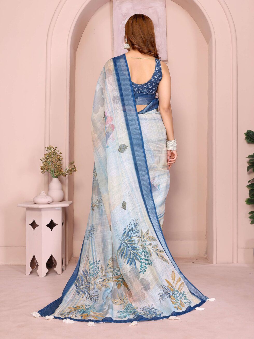 Refresh your wardrobe with this pastel blue linen cotton saree, adorned with tropical leaf motifs, a deep blue textured border, and white tassel-accented pallu ? perfect for festive, casual, or office wear.