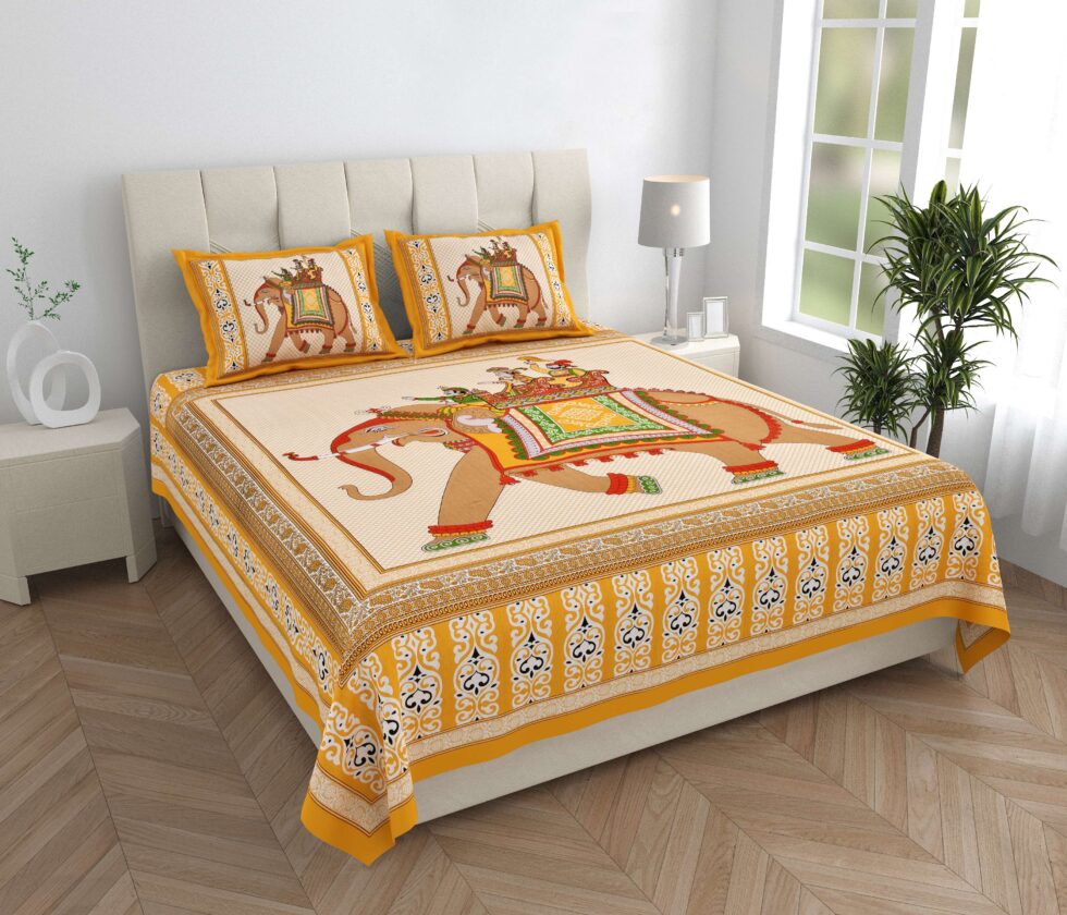 Add a royal charm to your bedroom with this Rajasthani Traditionally Printed Cotton Double Bed Bedsheet. Crafted from soft and breathable pure cotton, it features vibrant ethnic prints inspired by Rajasthan’s rich artistry. Comes with 2 matching pillow covers, ensuring comfort, elegance, and long-lasting freshness in every wash.