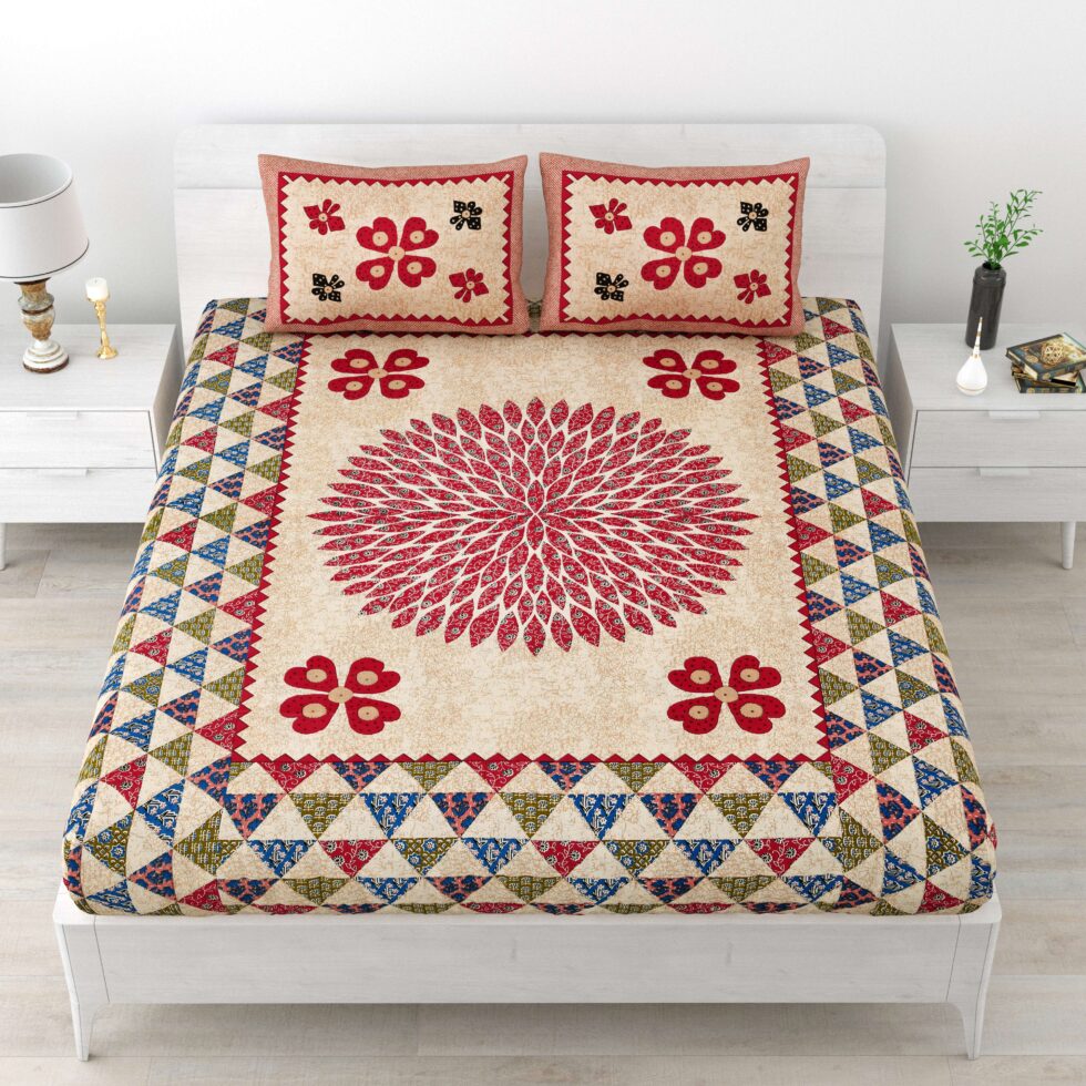 Add a royal charm to your bedroom with this Rajasthani Traditionally Printed Cotton Double Bed Bedsheet. Crafted from soft and breathable pure cotton, it features vibrant ethnic prints inspired by Rajasthan’s rich artistry. Comes with 2 matching pillow covers, ensuring comfort, elegance, and long-lasting freshness in every wash.