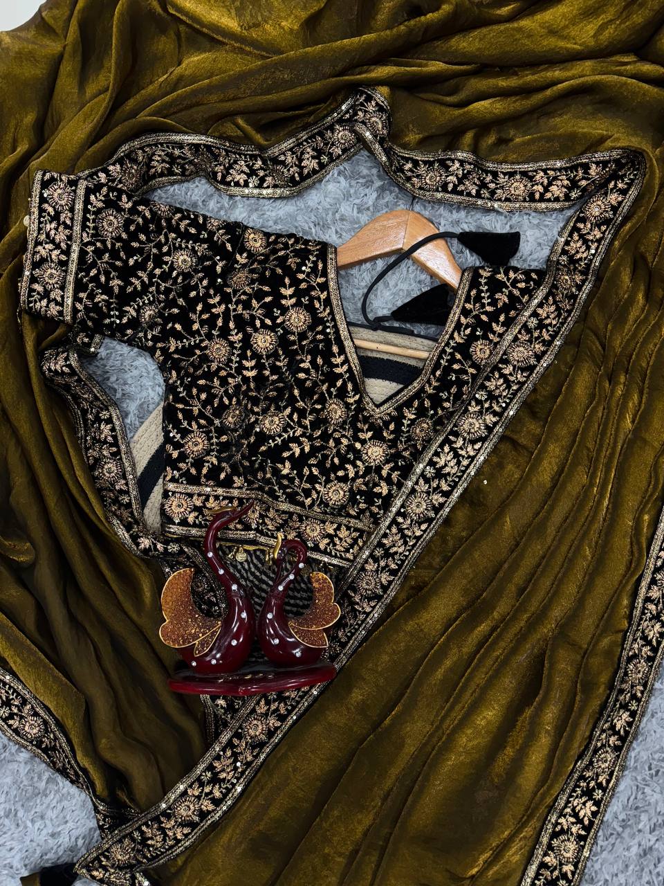 Women’s Luxe Olive-Gold Silk Saree with Heavily Embellished Blouse & Border – Ideal for Evening, Wedding & Reception Wear